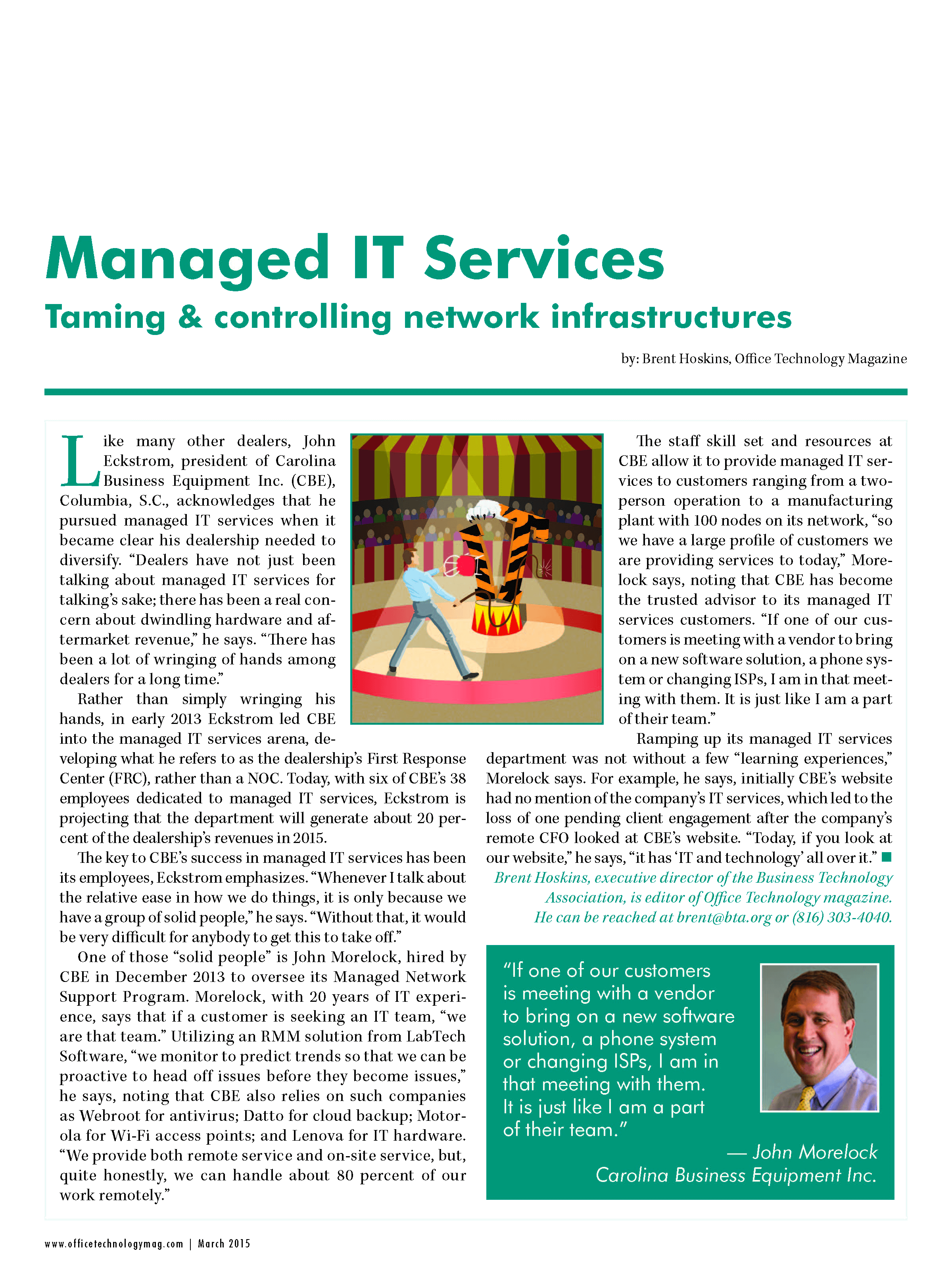 Carolina Business Equipment Inc. was recently featured in Office Technology Magazine for our leadership in Outsourced IT services. President of CBE, John Eckstrom discusses how he was instrumental in creating CBE’s First Response Center (FRC) in 2013. From the FRC, CBE’s employees can deliver and control remote IT services.